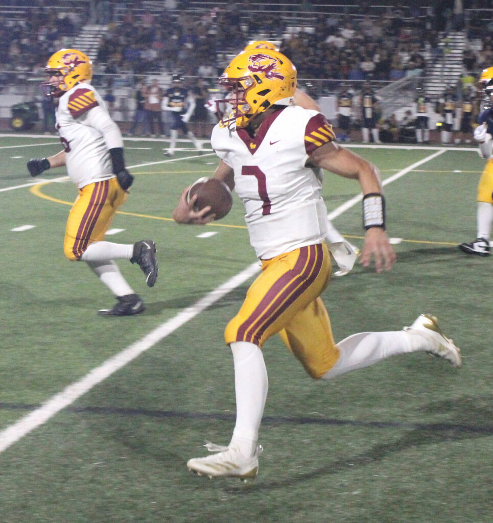 Los Banos quarterback Gavin Blackwood-Estrada runs for some of his 94 yards.