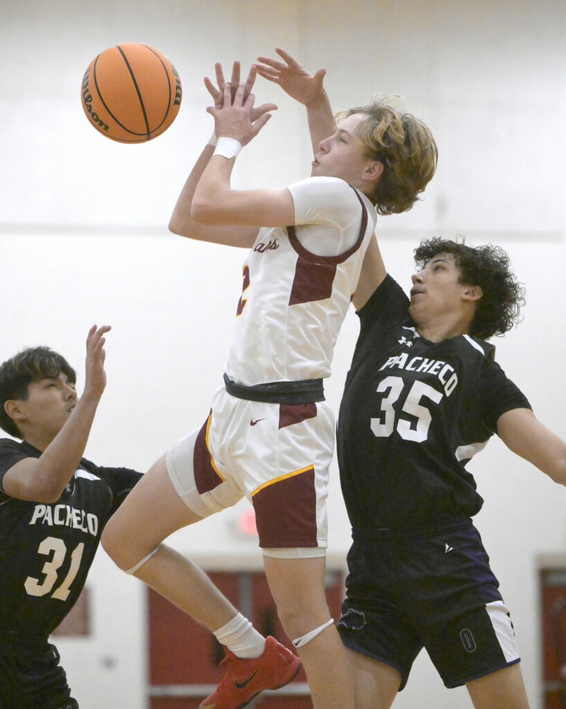Los Banos High JV player, Jaxon Mancebo, center, is fouled by Pacheco High player, Vincente Tomasello, right, while fellow Pacheco player, Anthony Calderon looks on.