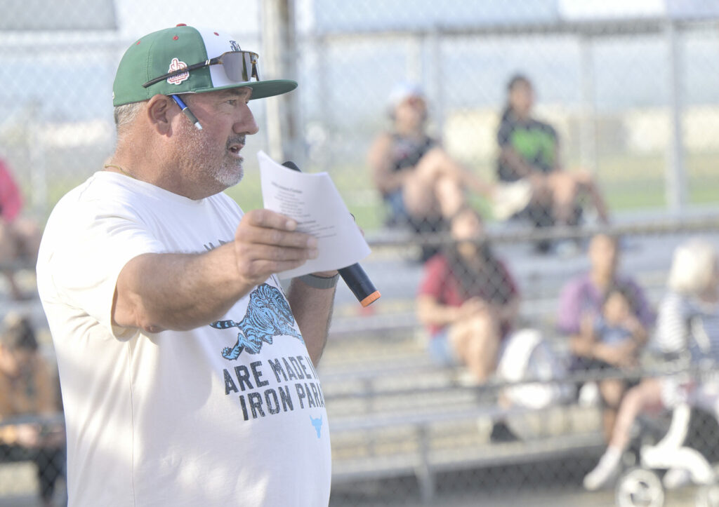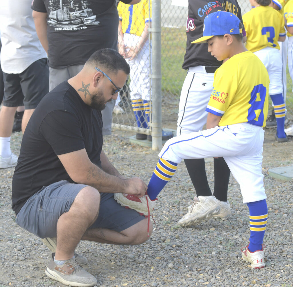 PICTURED CLOCKWISE FROM TOP LEFT: Los Banos Little League Atlanta Braves players parade onto the field during the Saturday opening ceremony; The coaches of last year’s Los Banos Little League championship team through out the ceremonial first pitch; Little League Giants Coash LeAnne Santos Sousa, right, hold the hand of her daughter and player MaryJo as they lead the team onto the field during the opening ceremony; Los Banos Little League President Dustin Caropreso leads the ceremony and introduces every team to the crowd; Oscar Chavez, left, ties his son, Adan Chavez’ shoe prior to the opening ceremony Saturday morning (GENE LIEB/The Express).
